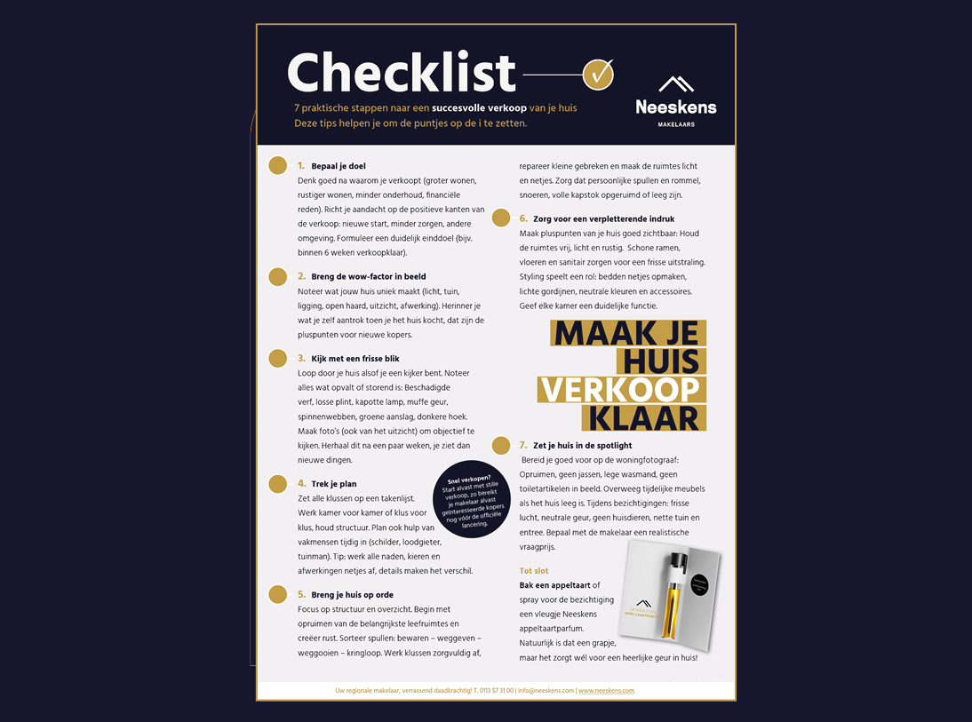 7 praktische stappen naar een succesvolle verkoop van je huis. Met deze checklist zorg je dat alles tiptop in orde is, deze tips helpen je om de puntjes op de i te zetten van voorbereiding tot overdracht.
